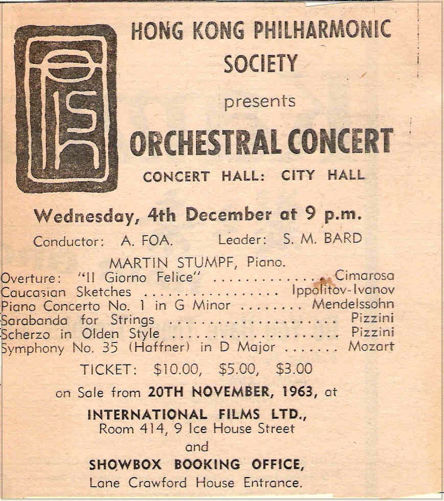 Concerto diretto da Arrigo Foa a Hong Kong il 4 Dicembre 1963