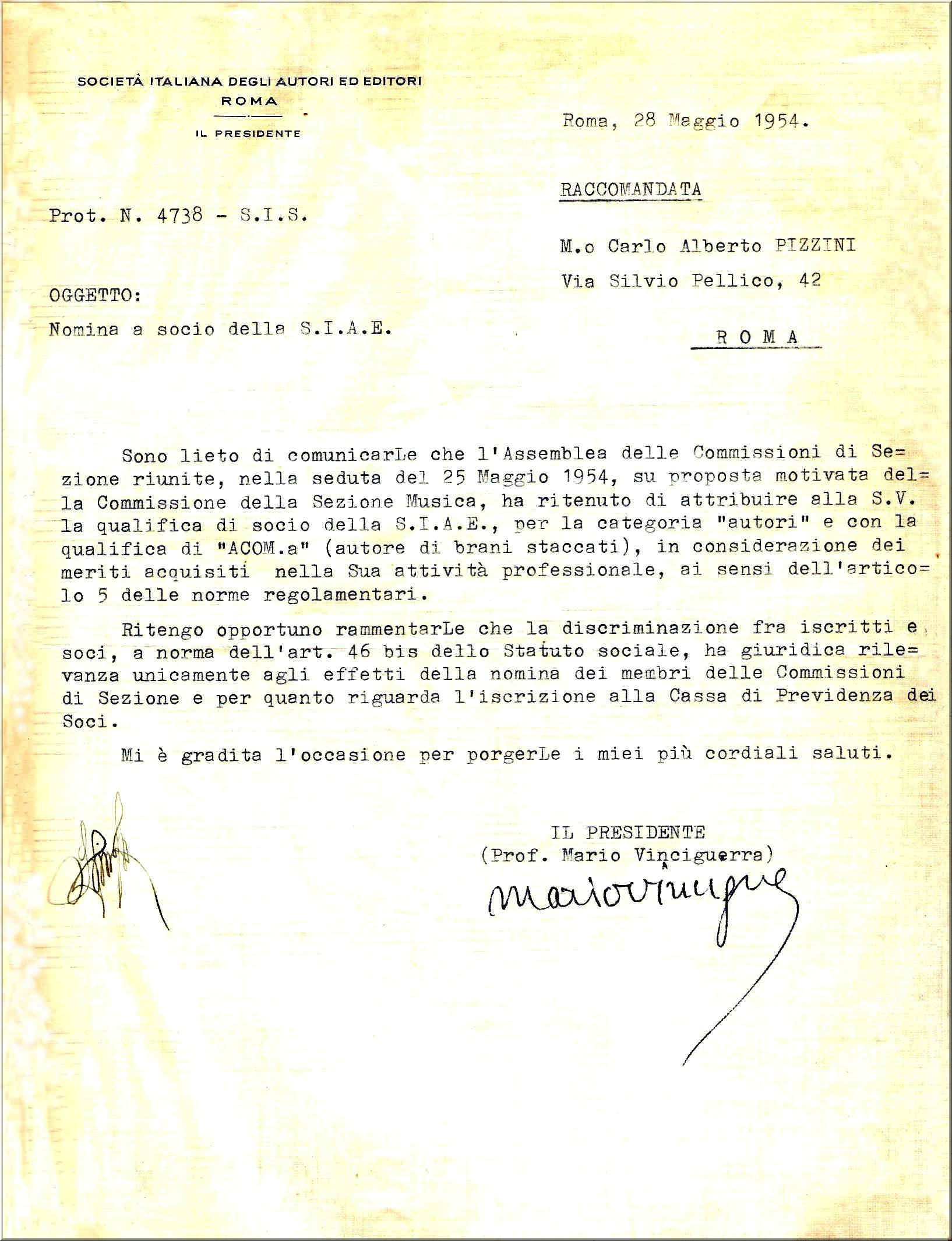 Nomina a Socio della SIAE (28 Maggio 1954)
